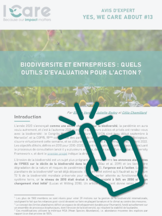 Avec cet avis d’expert, I Care tend à objectiver le lien entre activités économiques et biodiversité et à présenter les enjeux et les moyens d’une évaluation pertinente de l’impact sur la biodiversité, avec YWCA #13 : Biodiversité et entreprises : quels outils d’évaluation pour l’action ?
