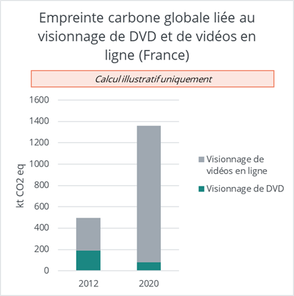 Par exemple, l’étude s’est intéressée à une évaluation simplifiée de l’empreinte carbone du visionnage de vidéos en ligne en France, et même si l’on consomme environ deux fois moins de DVD en 2020 (365 millions d’heures, source Statista) par rapport à 2012 (847 millions d’heures, source Statista), l’augmentation du visionnage de vidéos en ligne (de 4 270 millions d’heures en 2012 à 17 937 millions d’heures en 2020, selon le Baromètre du numérique 2021 de l’ARCEP) fait exploser l’empreinte carbone globale du visionnage de vidéos, films ou programmes audiovisuel.